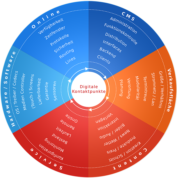 Die Entwicklung, Planung und Realisierung von digitaler Kommunikation am Verkaufspunkt erfordert eine weit blickende Kombination verschiedenster Teilaspekte und eine fächerübergreifende Arbeitsweise der verschiedenen Abteilungen. Marketing, Vertrieb, IT und Ladenbau sollten in den ganzheitlichen Planungsprozess miteinbezogen werden.